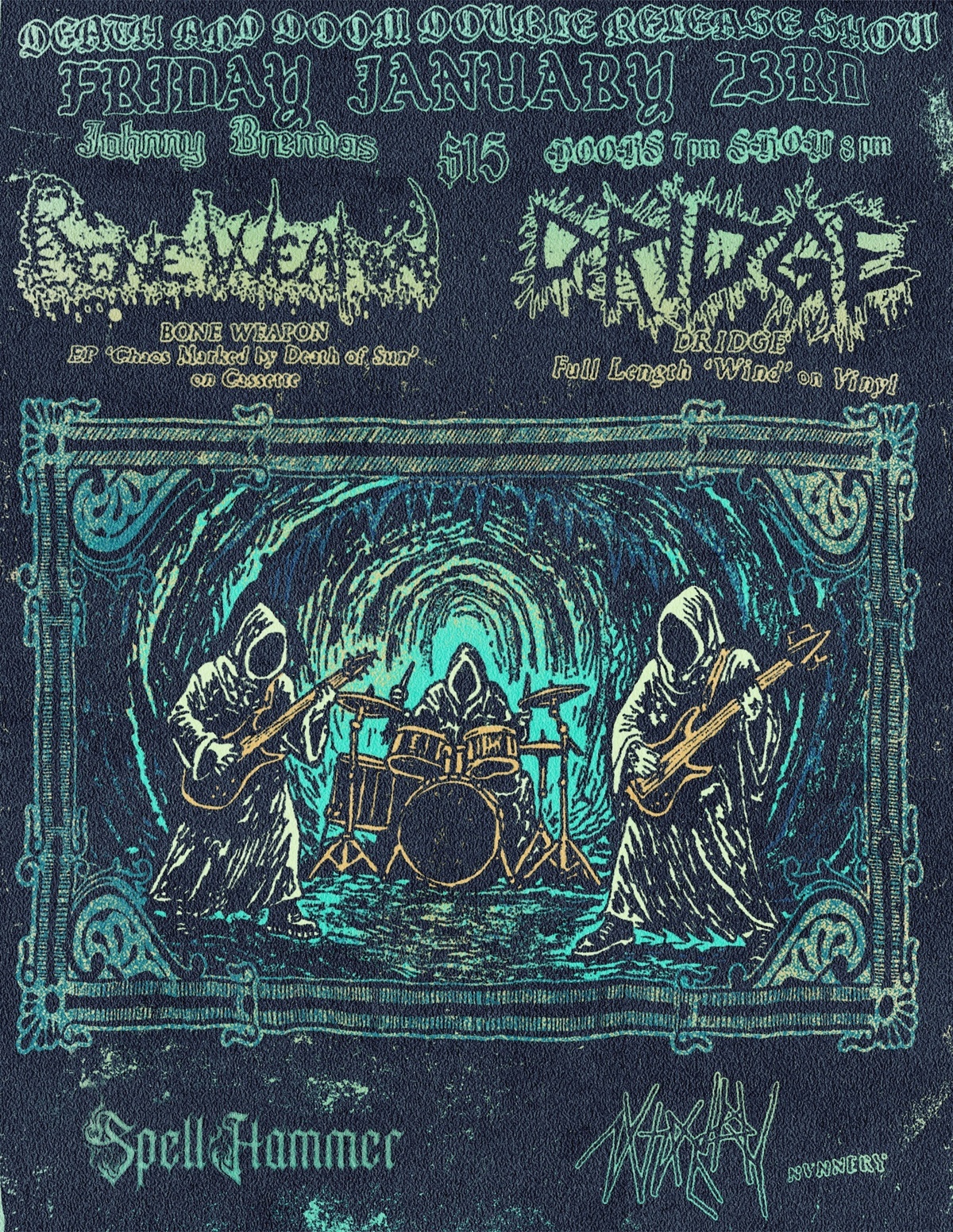 DRIDGE - Dridge return with an extremely rare live performance for "Wind", their 3rd full length LP. Not to be missed! Continuing down the cold, dark path of psychedelic dislocation and despair, Wind creates a soundscape capturing the essence of the bleak, windy abyss of modernity. For those that are uninitiated, think of equal parts WINTER and OBITUARY with some HELLHAMMER and CELTIC FROST in the mix. https://dridge.bandcamp.com/album/wind