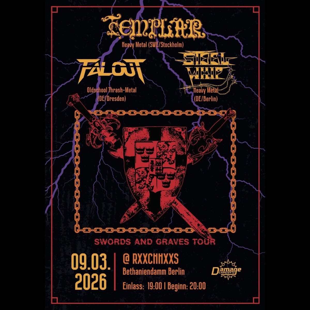 With TEMPLAR releasing their new Album Conquering Swords in February they bring raw,traditional Heavy Metal on the Stage. Supported by FALOUT, a Newcomer Oldschool Metal Band with pure On-Stage Power and razor sharp Riffs. And STEEL WHIP with a dungeon like Underground Heavy-Metal Punk Sound and memorizeable Riffs, that punch right into your Soul